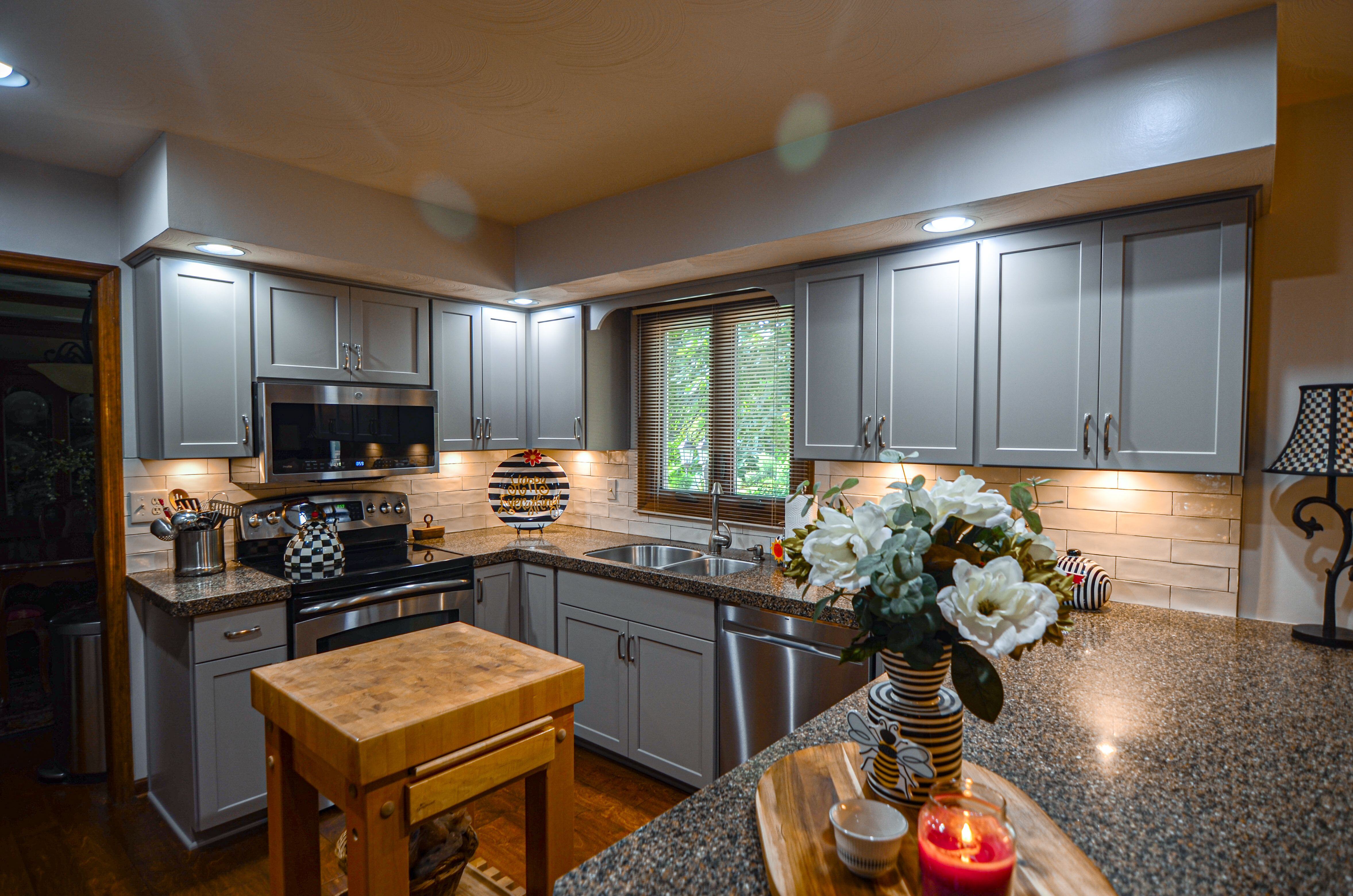 Outdated kitchen cabinets were upgraded by refacing with a more modern color and style. Crown molding was added to the top of cabinets to finish the look. Project completed by JSB Home Solutions.#2 Short Project Timeline