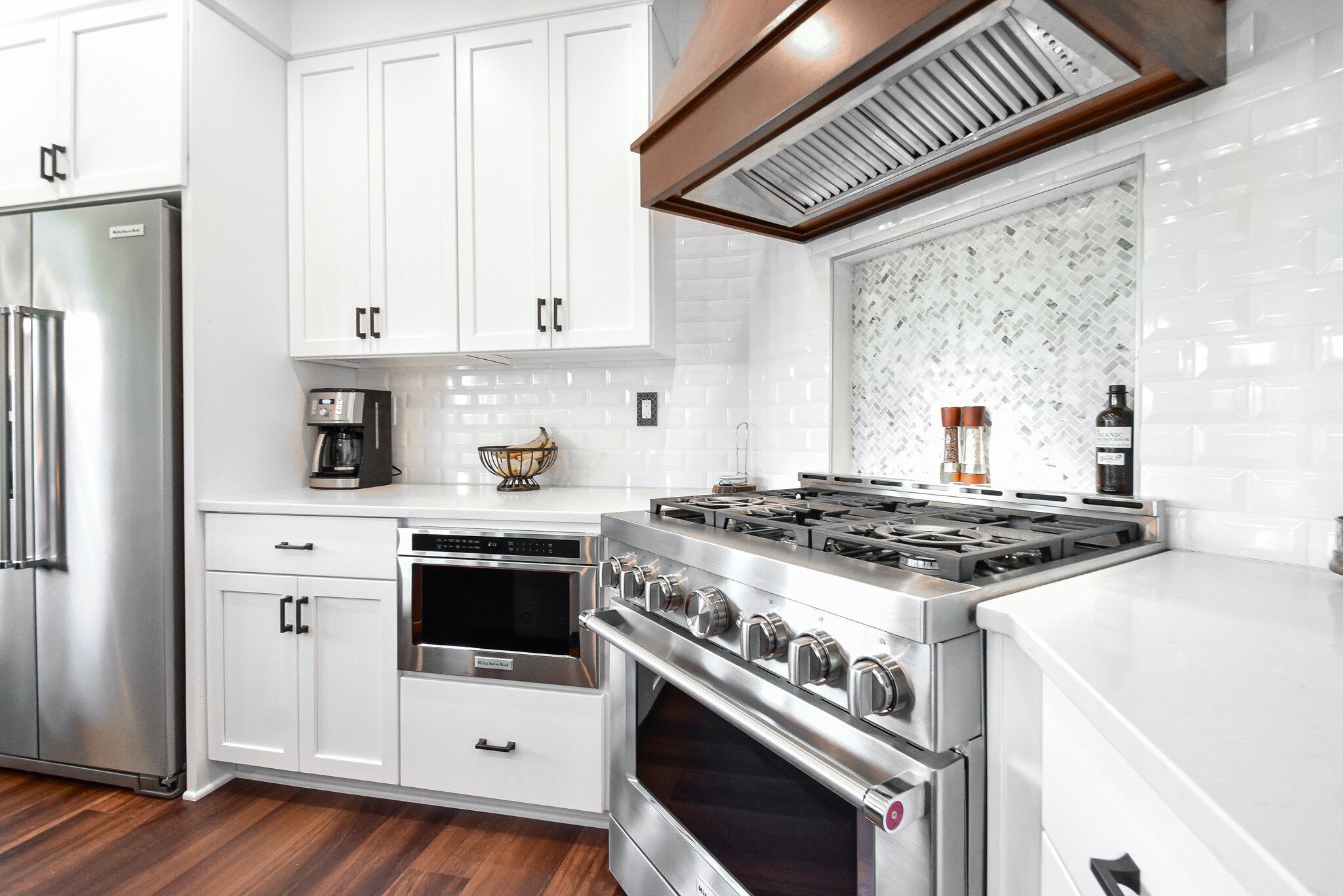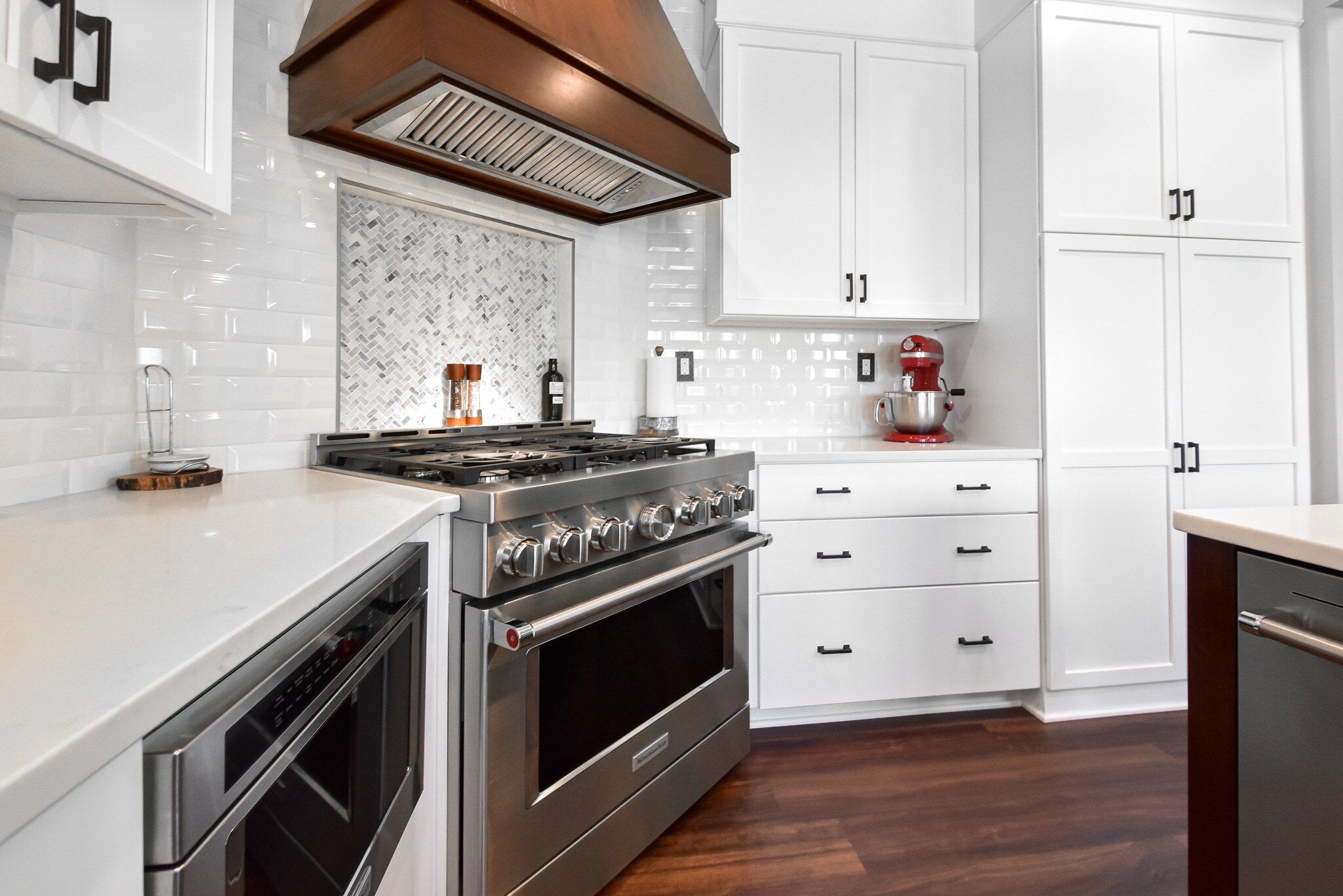 We chose Hard Maple for the main cabinetry in a pristine white finish and Hickory for the island, both in the timeless Shaker style, to ensure a harmonious blend of durability and style. This choice not only provides a visually appealing contrast but also offers the resilience needed for a busy kitchen environment.