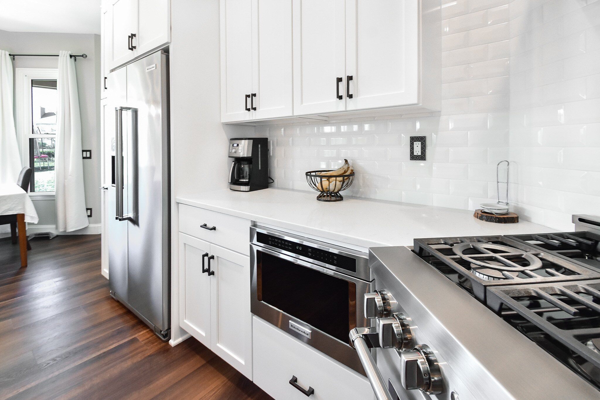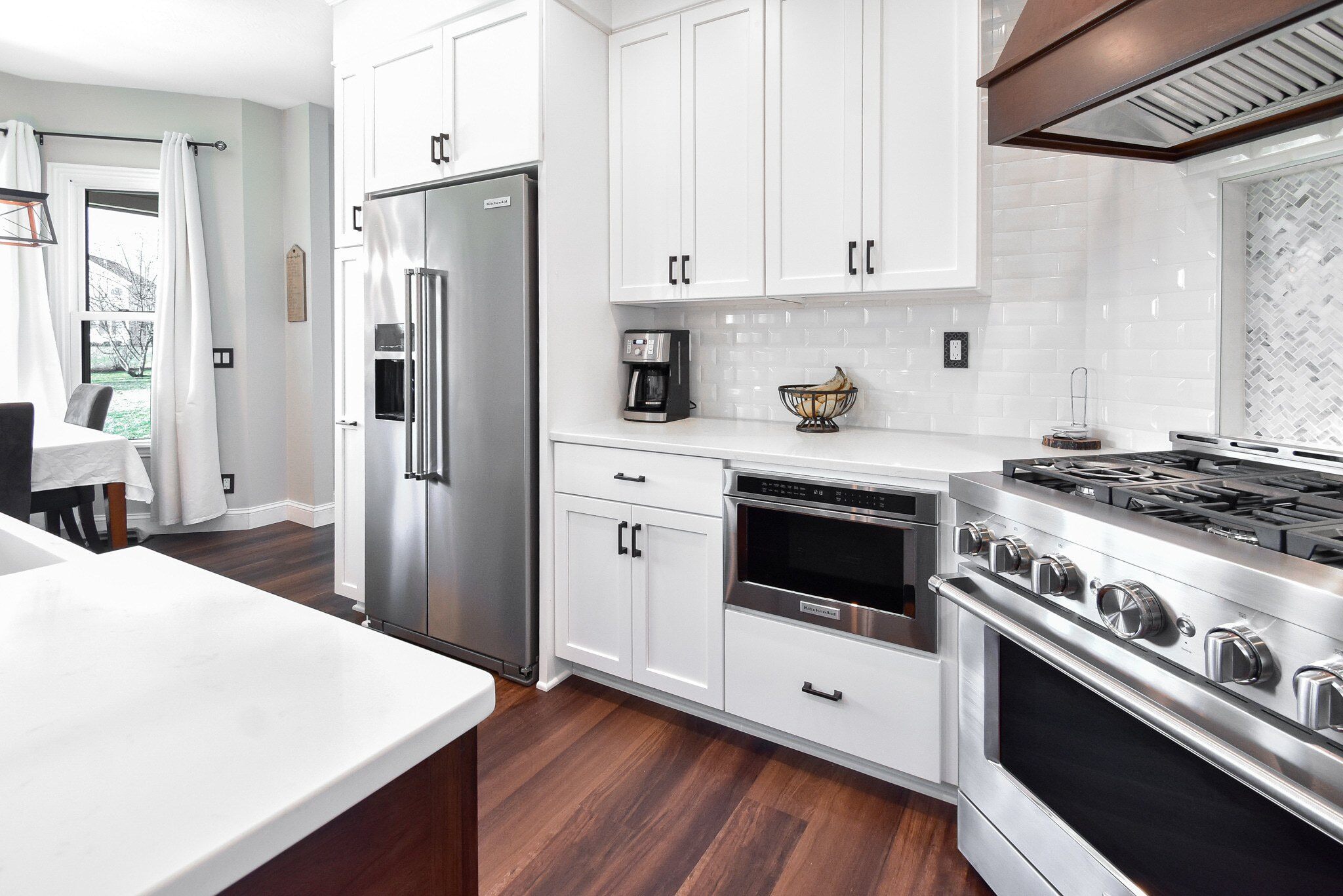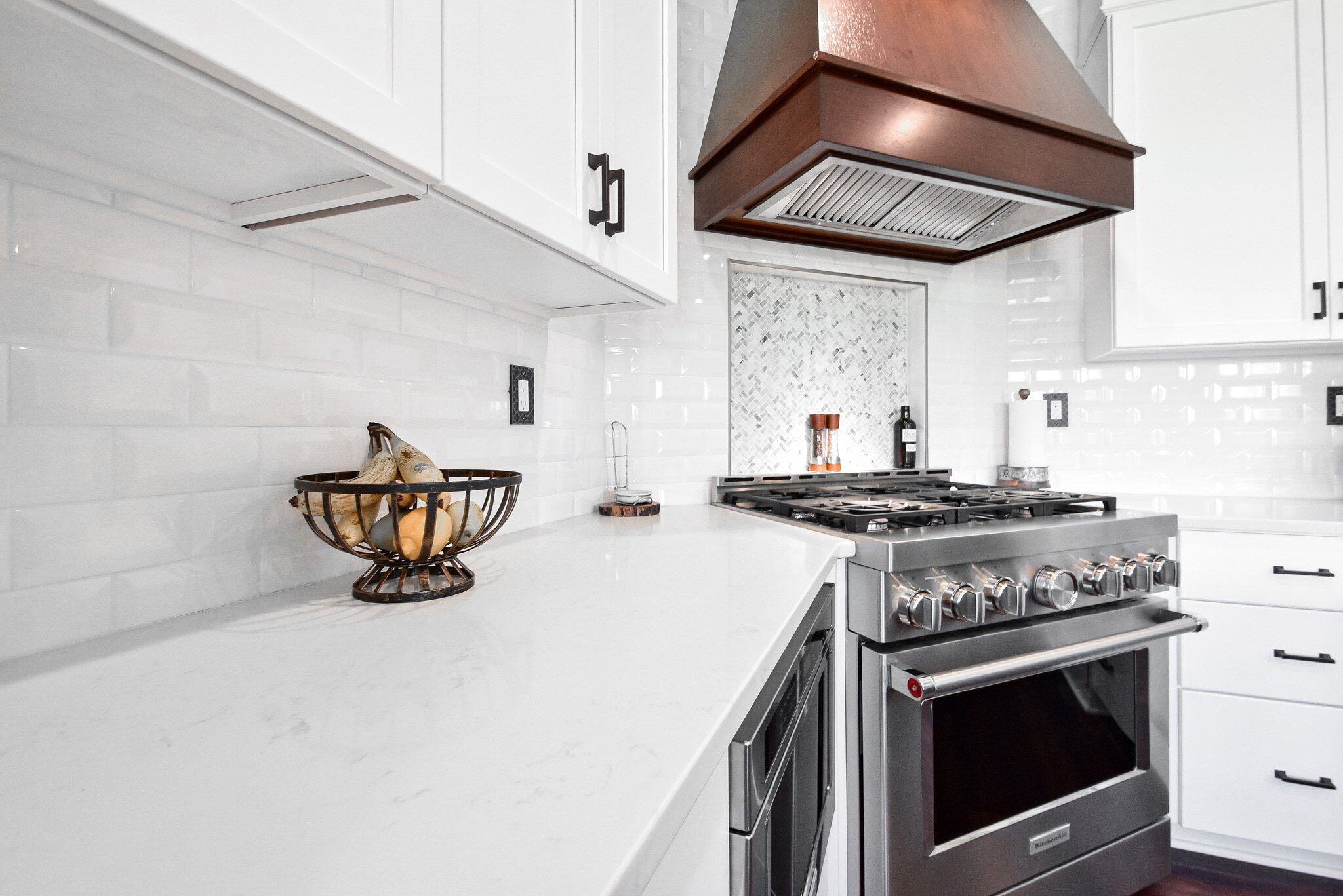 The kitchen's aesthetics are elevated by the Rittenhouse Square tiles in Arctic White for the backsplash, paired seamlessly with premium quartz countertops. These materials were selected for their beauty and their ability to withstand the demands of daily kitchen activities, ensuring a lasting elegance in the heart of the home.