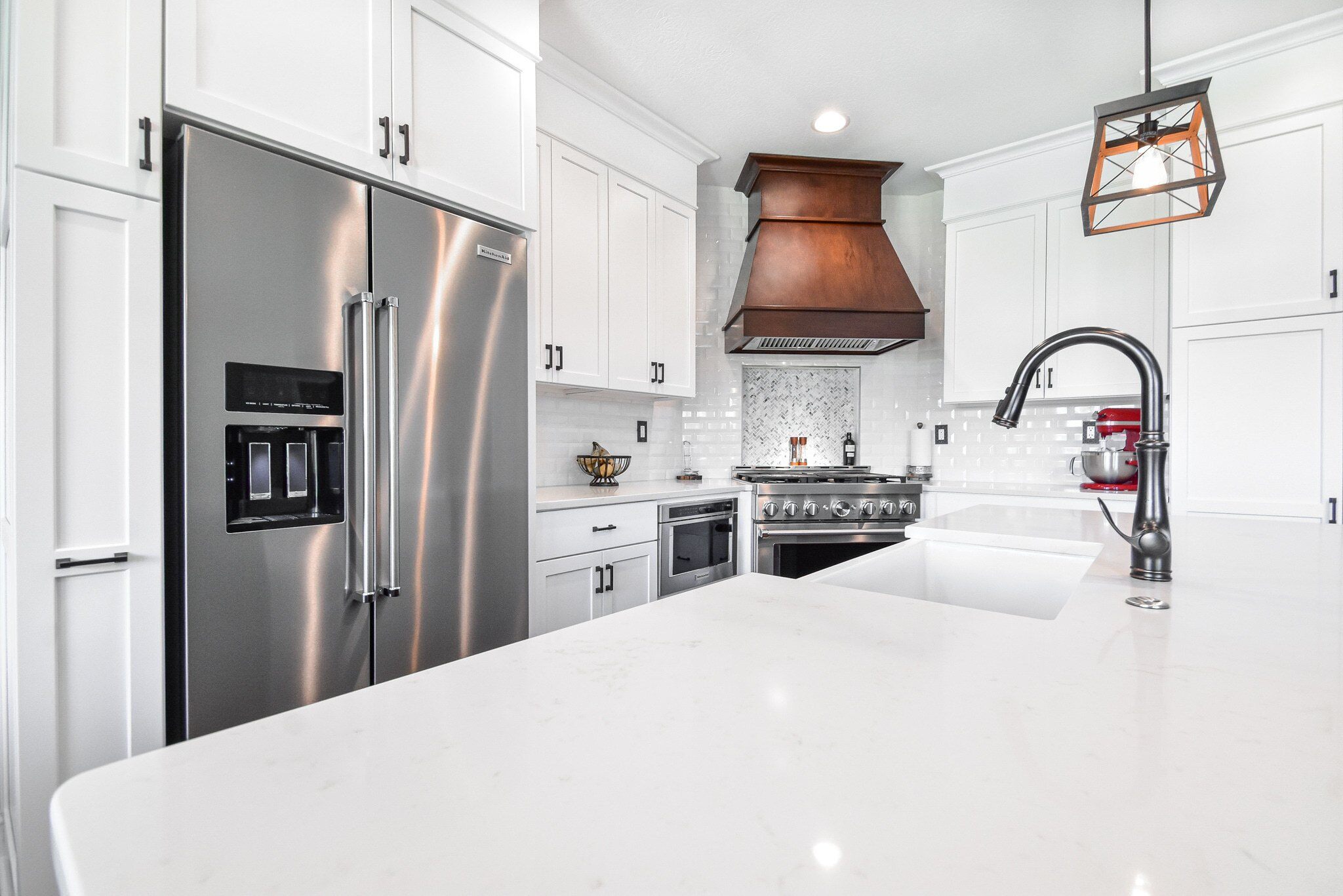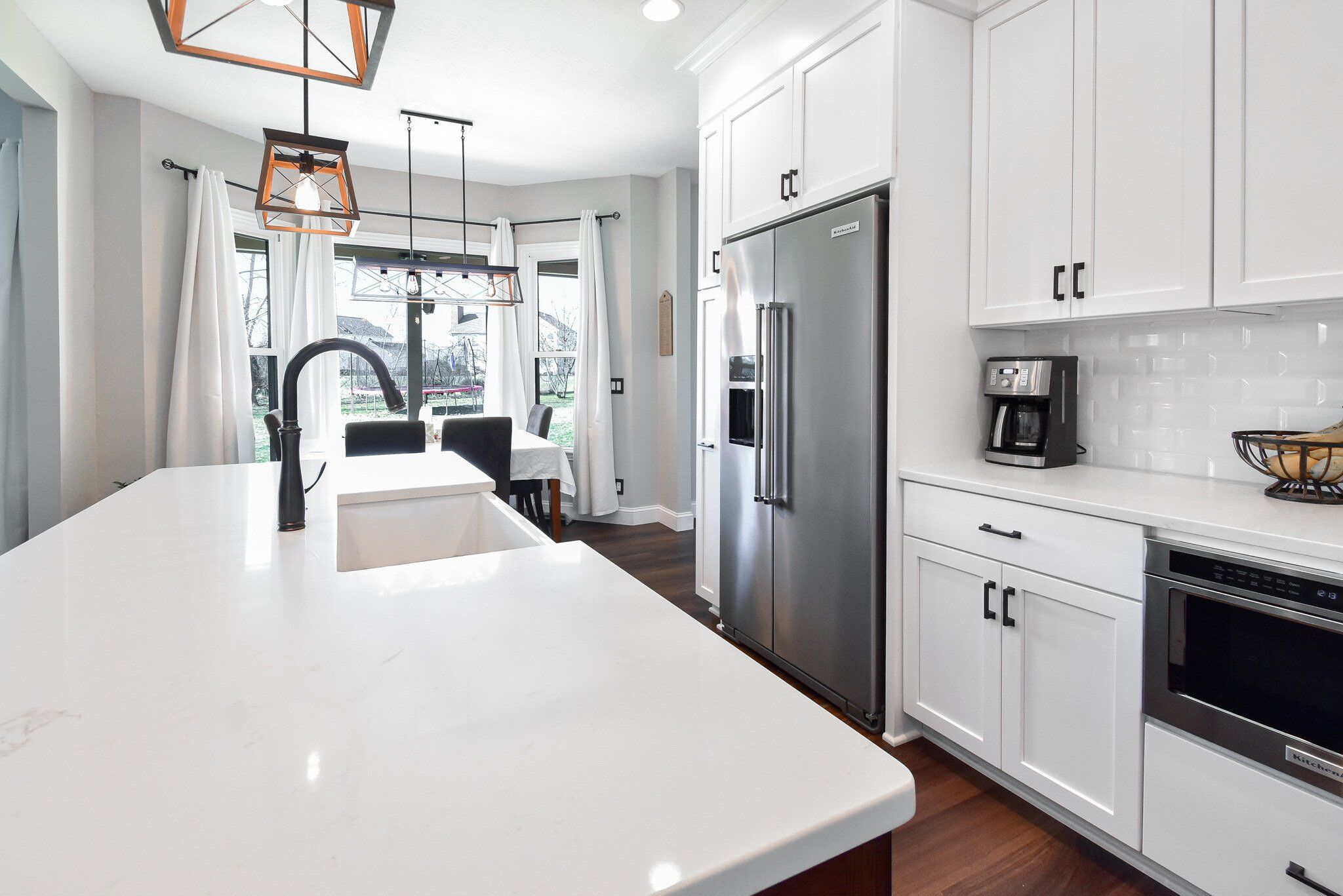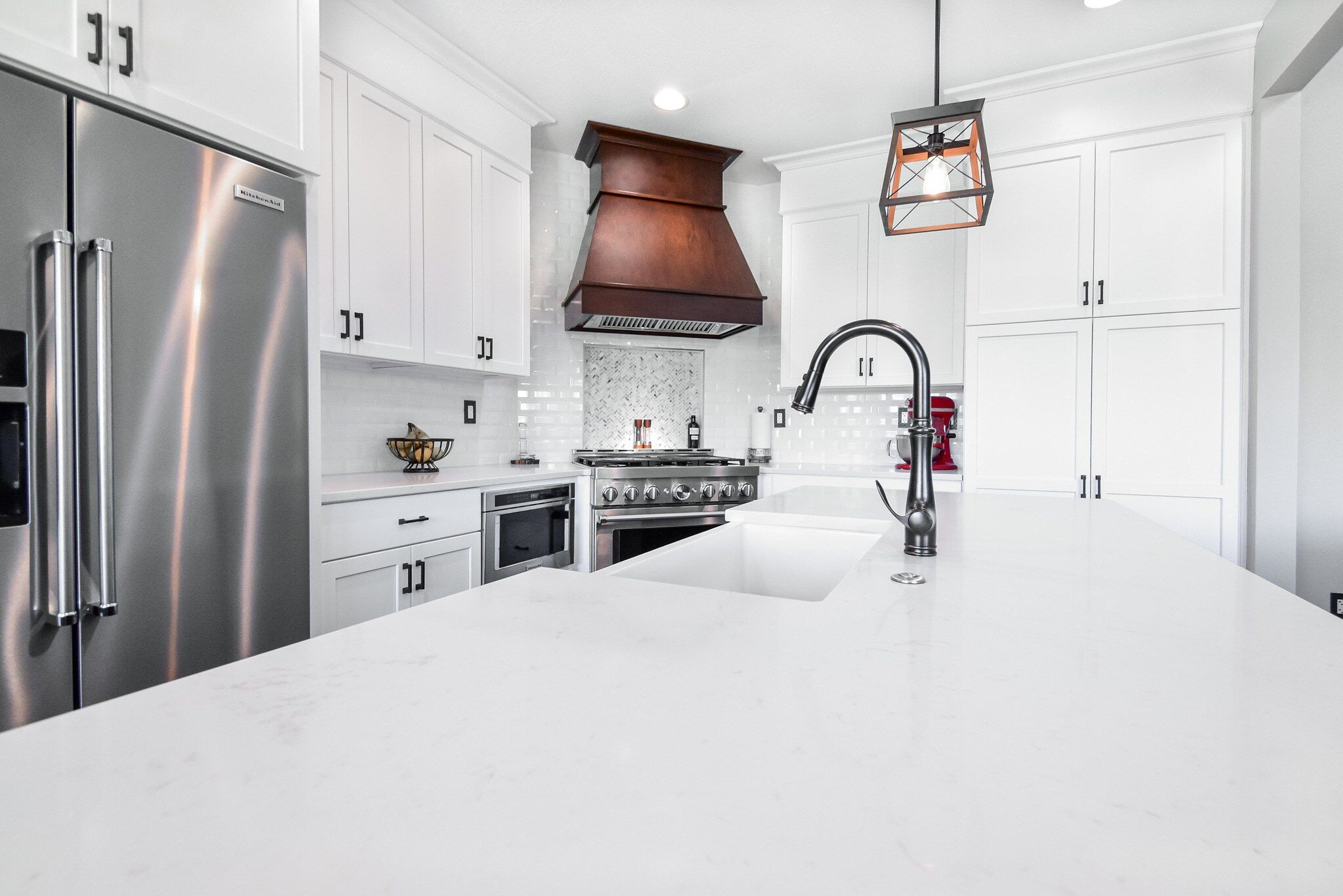 The kitchen's aesthetics are elevated by the Rittenhouse Square tiles in Arctic White for the backsplash, paired seamlessly with premium quartz countertops. These materials were selected for their beauty and their ability to withstand the demands of daily kitchen activities, ensuring a lasting elegance in the heart of the home.