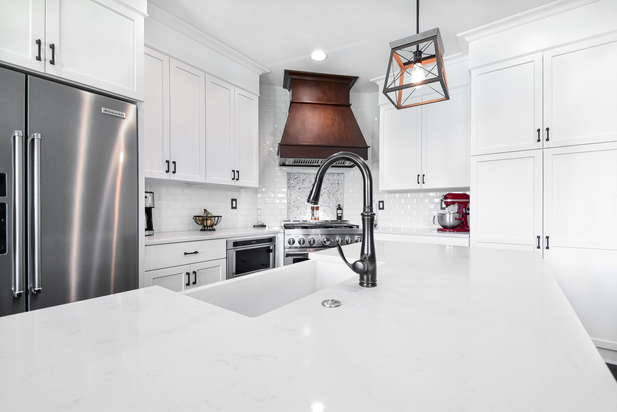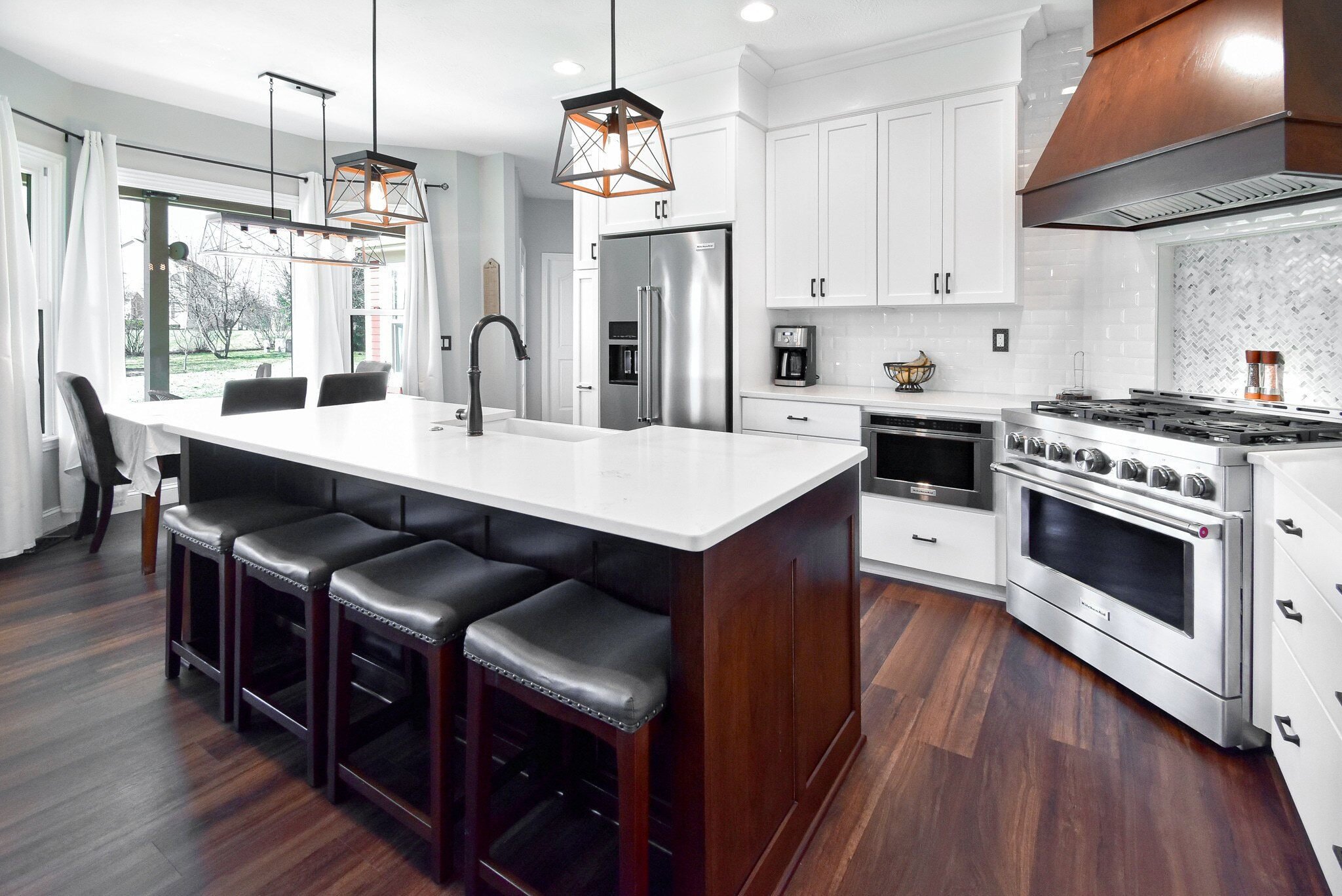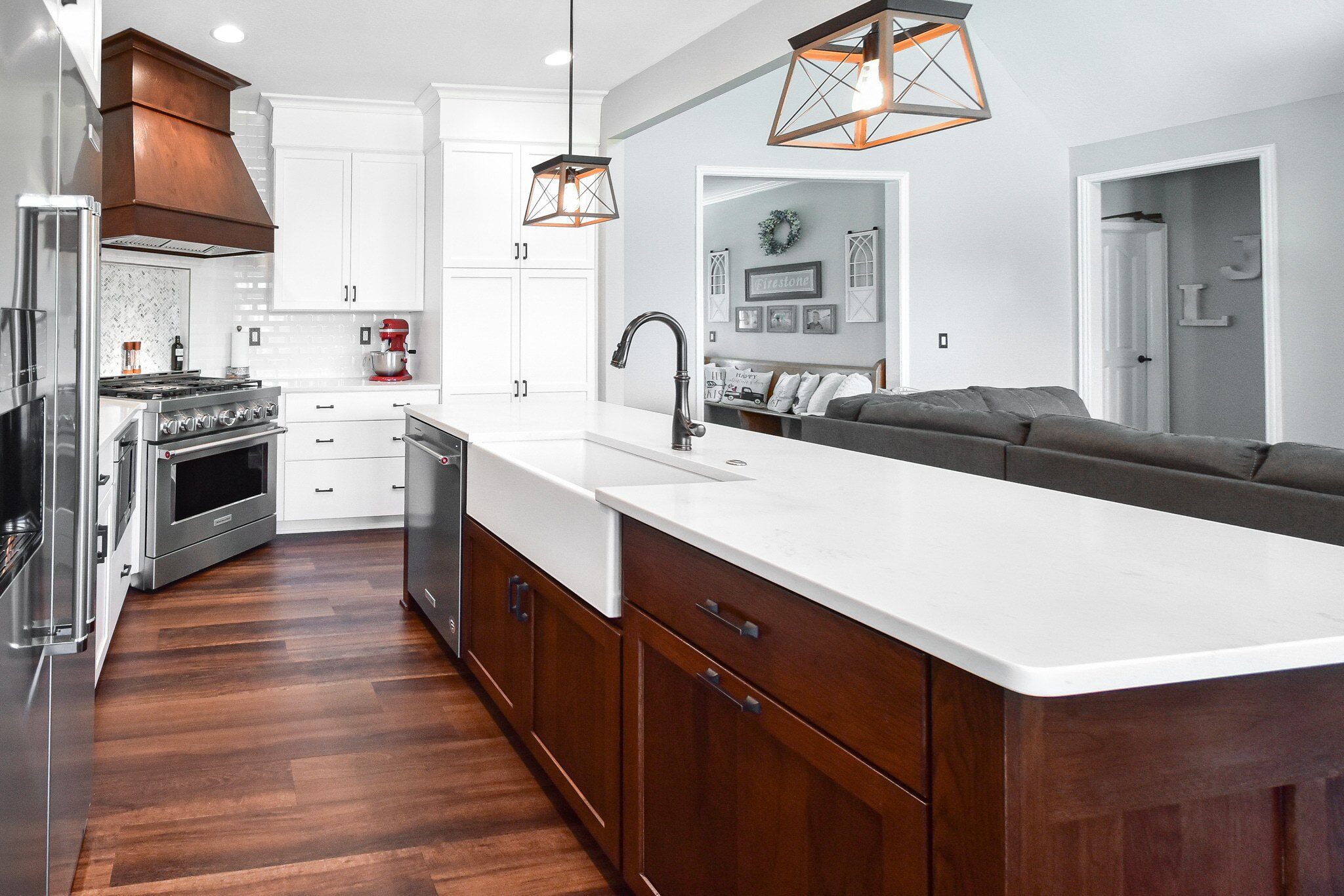 Our remodel includes a custom vent hood in Rustic Hickory that matches the island’s Shaker style, alongside a farmhouse apron sink that adds a touch of country elegance. The kitchen is also equipped with a Bellera pull-down faucet in oil-rubbed bronze, enhancing the overall functionality while providing a striking focal point. These thoughtful additions are designed to improve the kitchen's efficiency and aesthetic appeal, making it a centerpiece of the home.