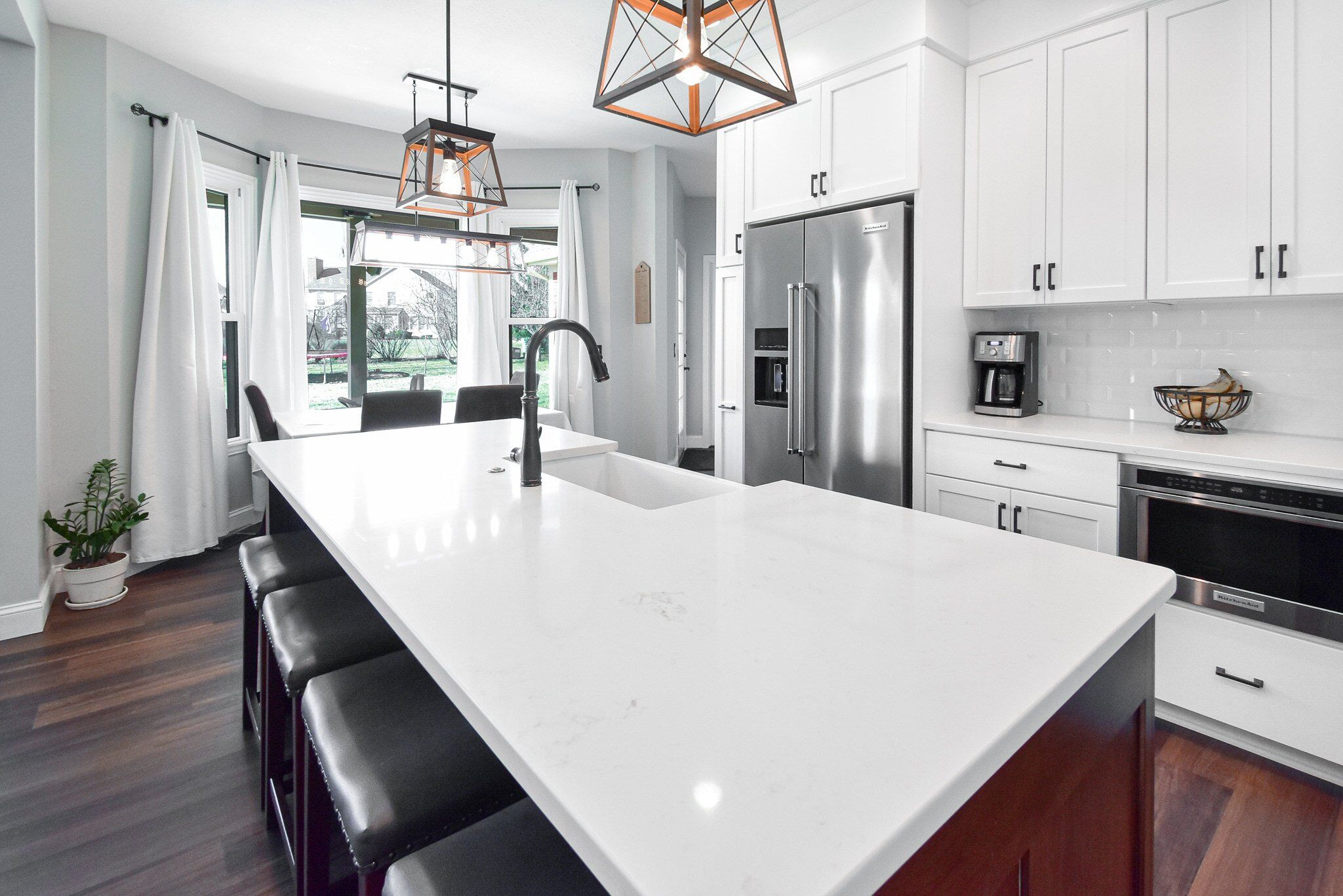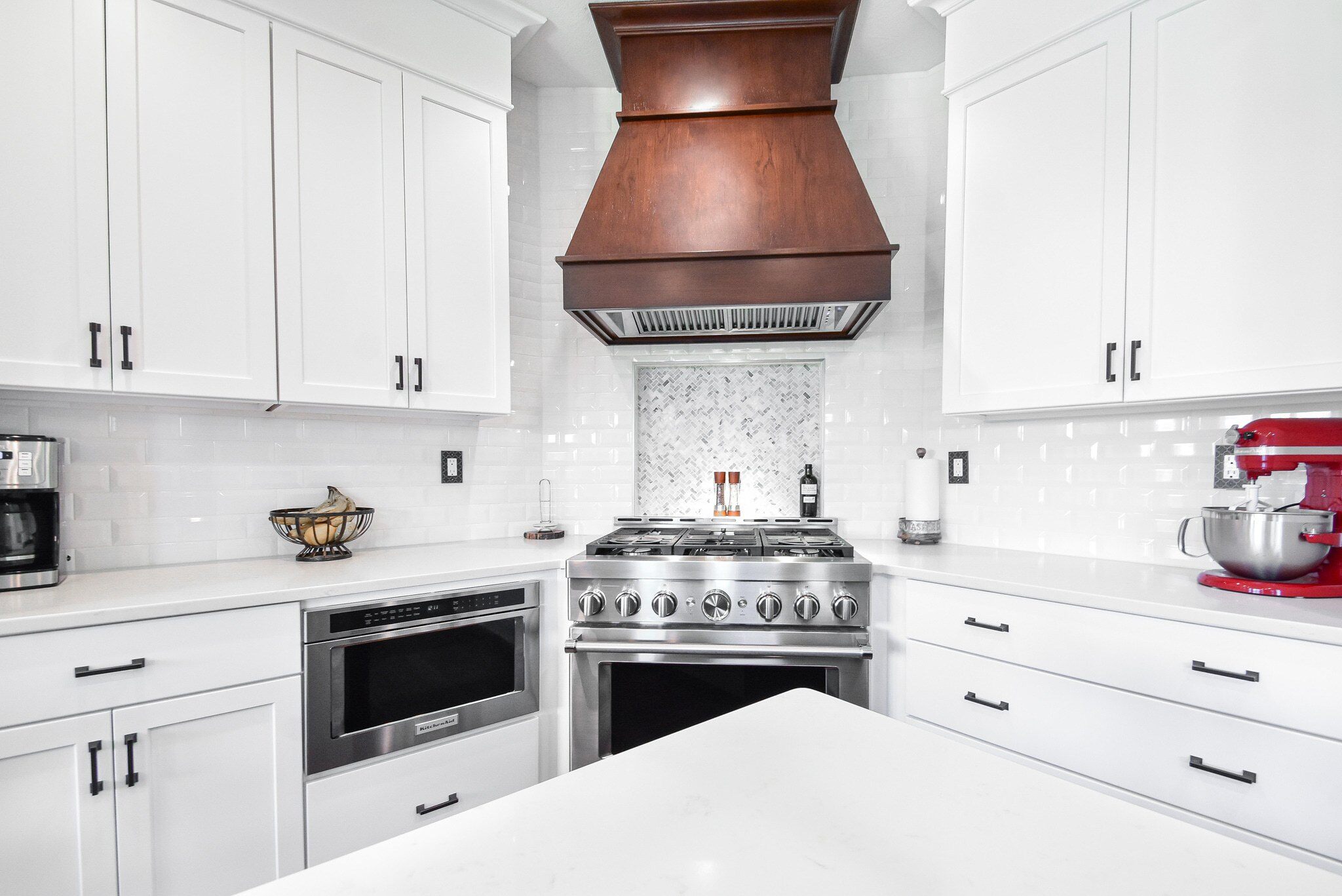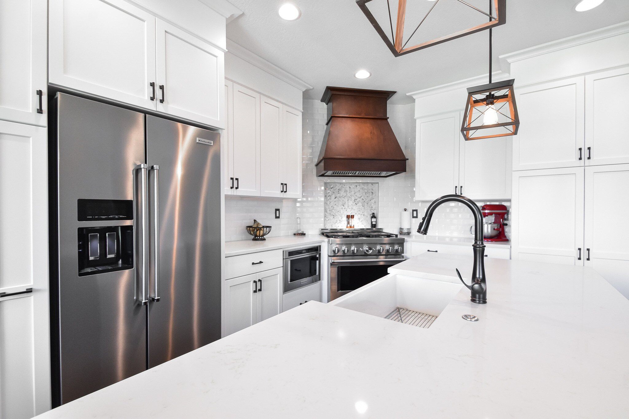 Our remodel includes a custom vent hood in Rustic Hickory that matches the island’s Shaker style, alongside a farmhouse apron sink that adds a touch of country elegance. The kitchen is also equipped with a Bellera pull-down faucet in oil-rubbed bronze, enhancing the overall functionality while providing a striking focal point. These thoughtful additions are designed to improve the kitchen's efficiency and aesthetic appeal, making it a centerpiece of the home.