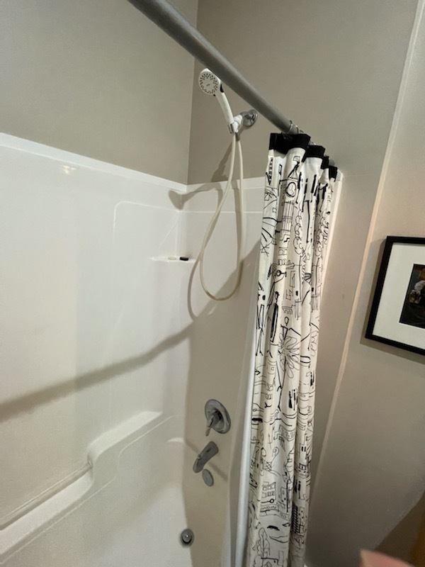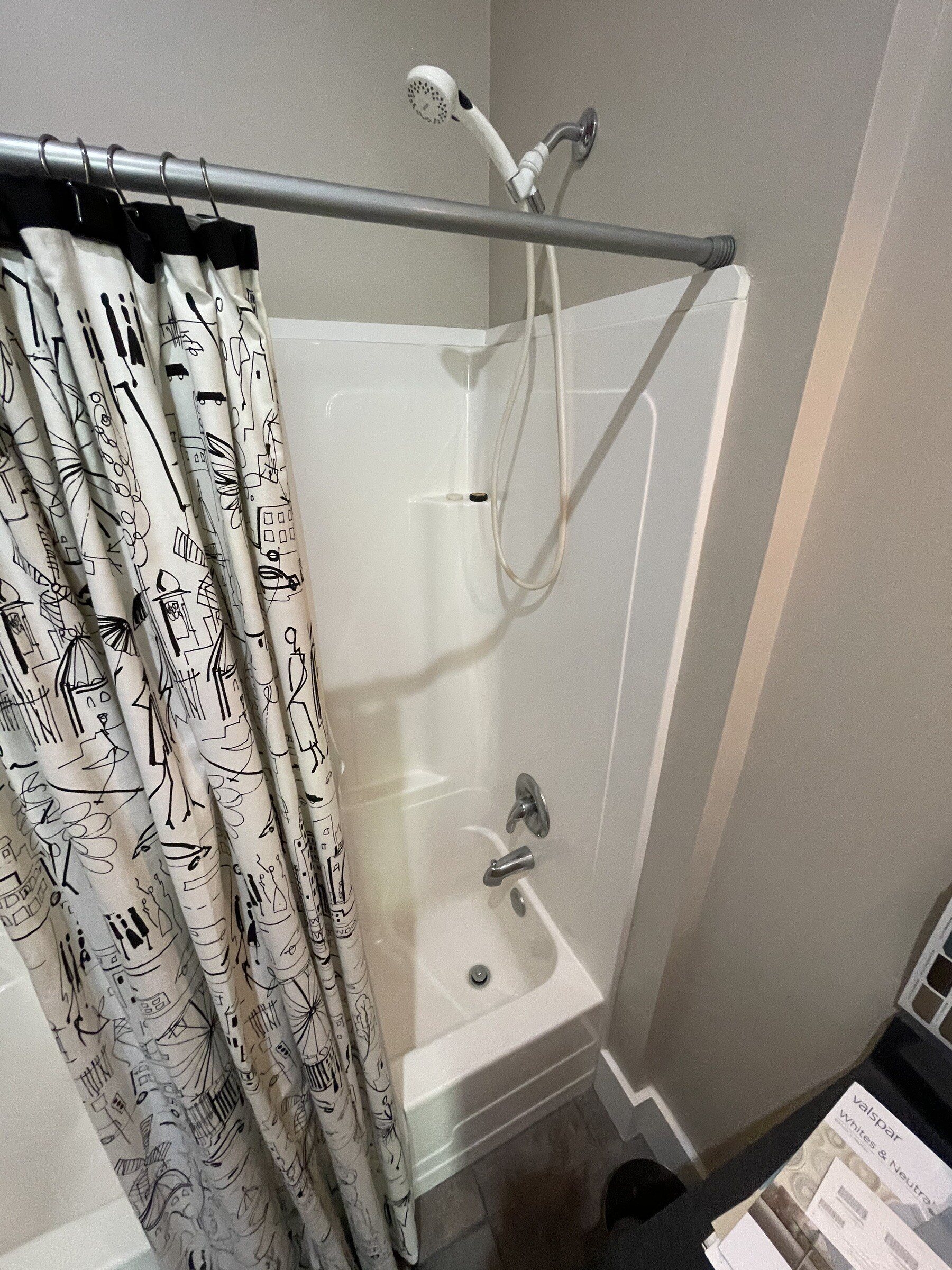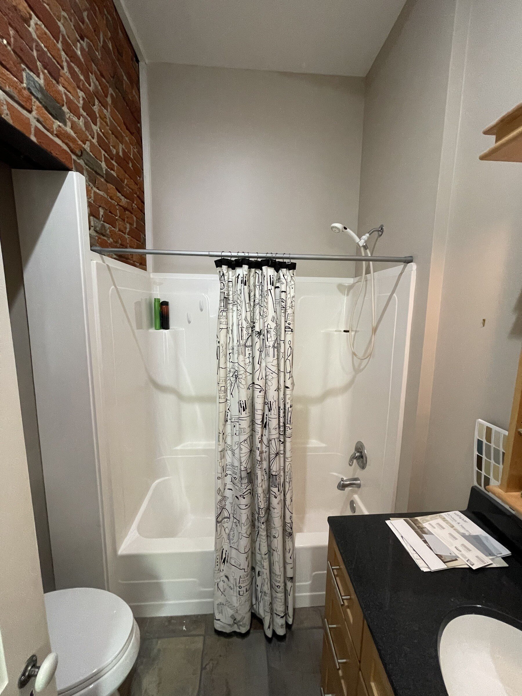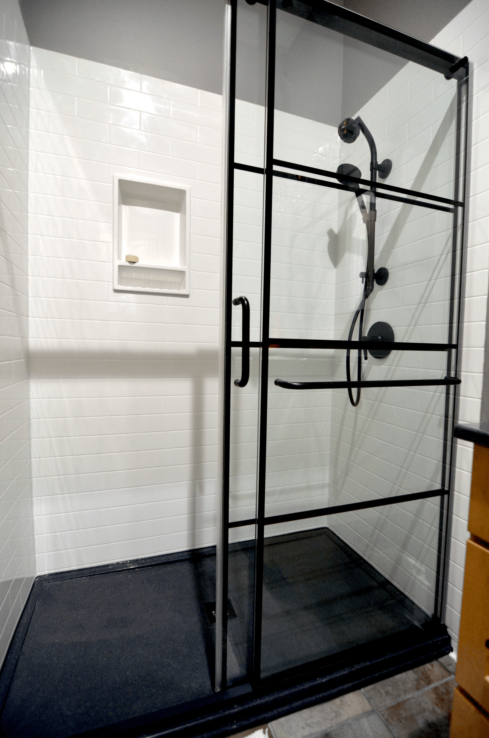 We installed a stylish Onyx smooth gloss shower base in Constellation color, featuring a practical 1 7/8″ curb height and a center drain with a pebble surface style that ensures safety and adds a tactile element. The enclosure is completed with a 60″ sliding clear glass door with matte black finishes, providing a sleek, modern look while maintaining functional elegance.