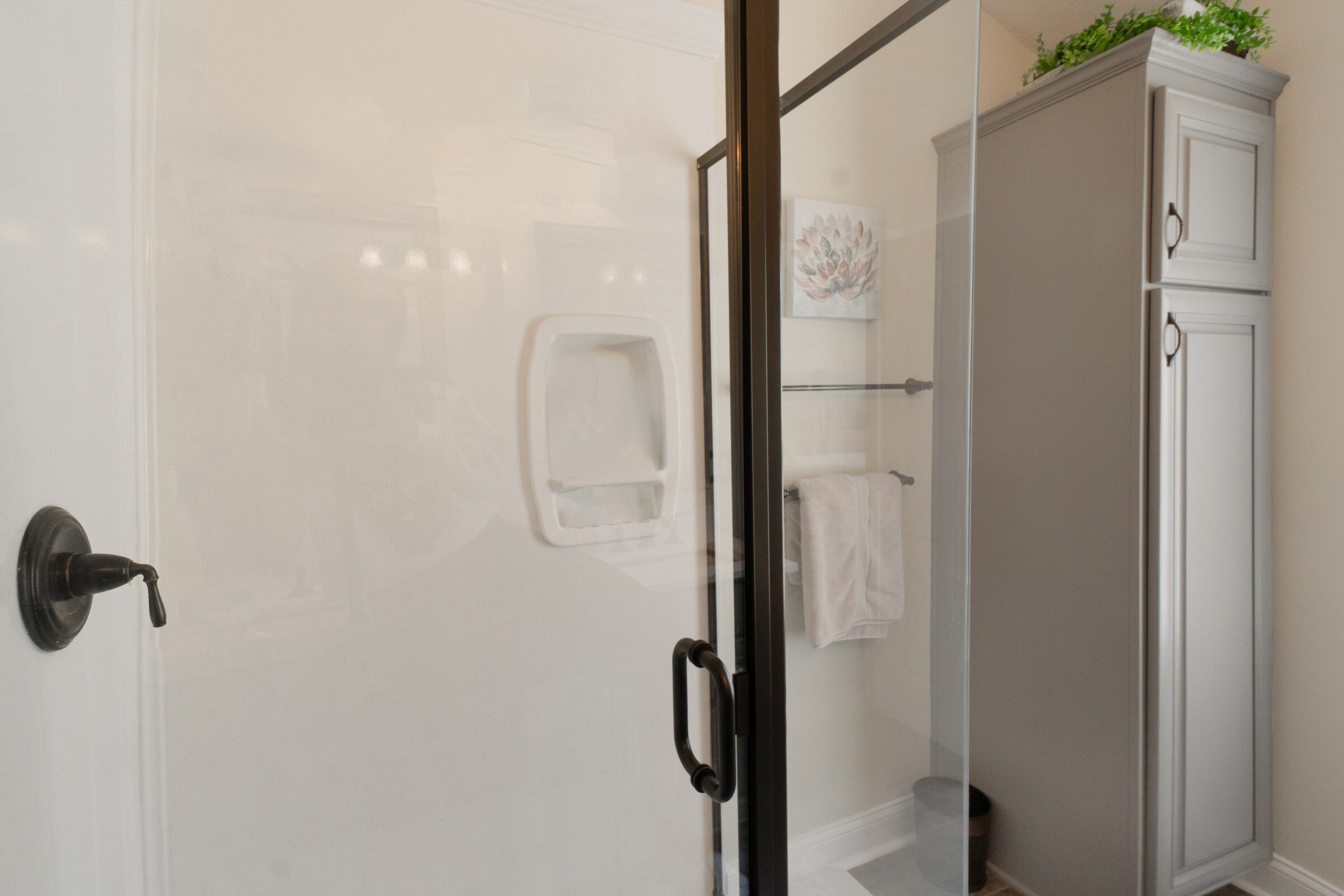 Our bathroom remodel in Dublin is a testament to how we marry sophistication with functionality to create spaces that truly enhance everyday living. The project features a sleek, monochrome theme with a solid white shower base and glossy walls, complemented by custom glass enclosures and trim in oil rubbed bronze for a touch of luxury. The vanity, in Sidewalk Grey with Kensington door style and glossy Pepper countertops, not only adds visual interest but also maximizes the functionality of the space with its durable and stylish design.