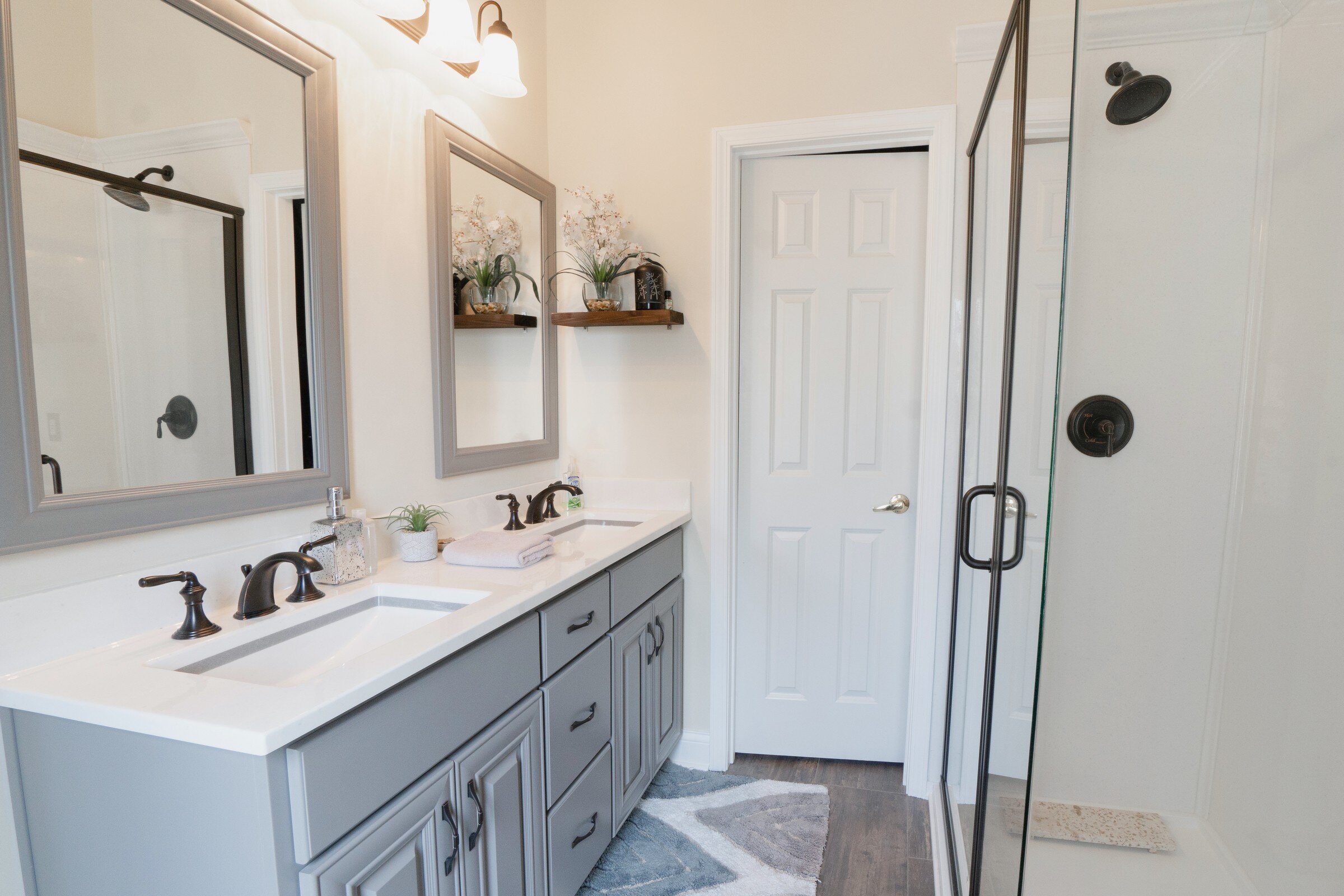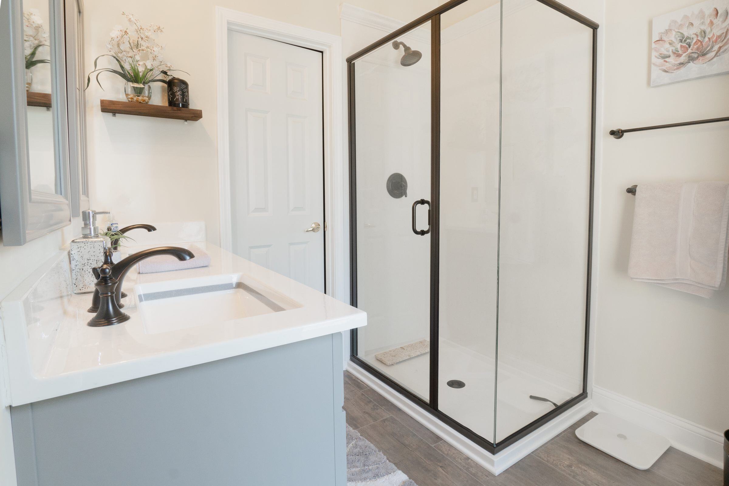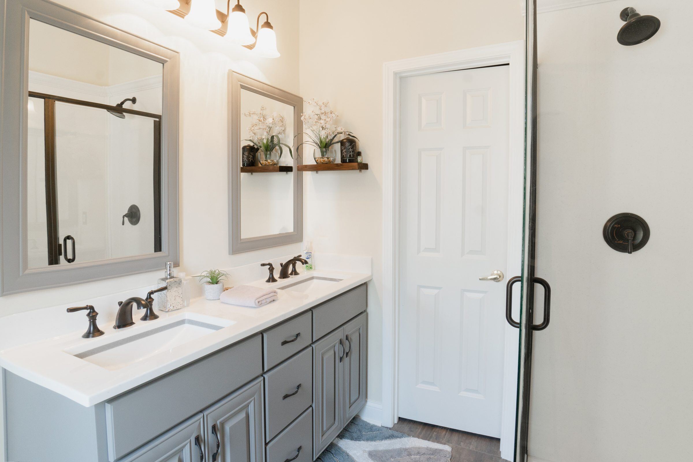 The vanity area is designed with functionality and style in mind, featuring a Kensington door style vanity in Sidewalk Grey, accented with oil rubbed bronze cabinet pulls. The glossy Pepper countertops not only enrich the space visually but also offer a durable surface that stands up to daily use, making it perfect for a busy household.