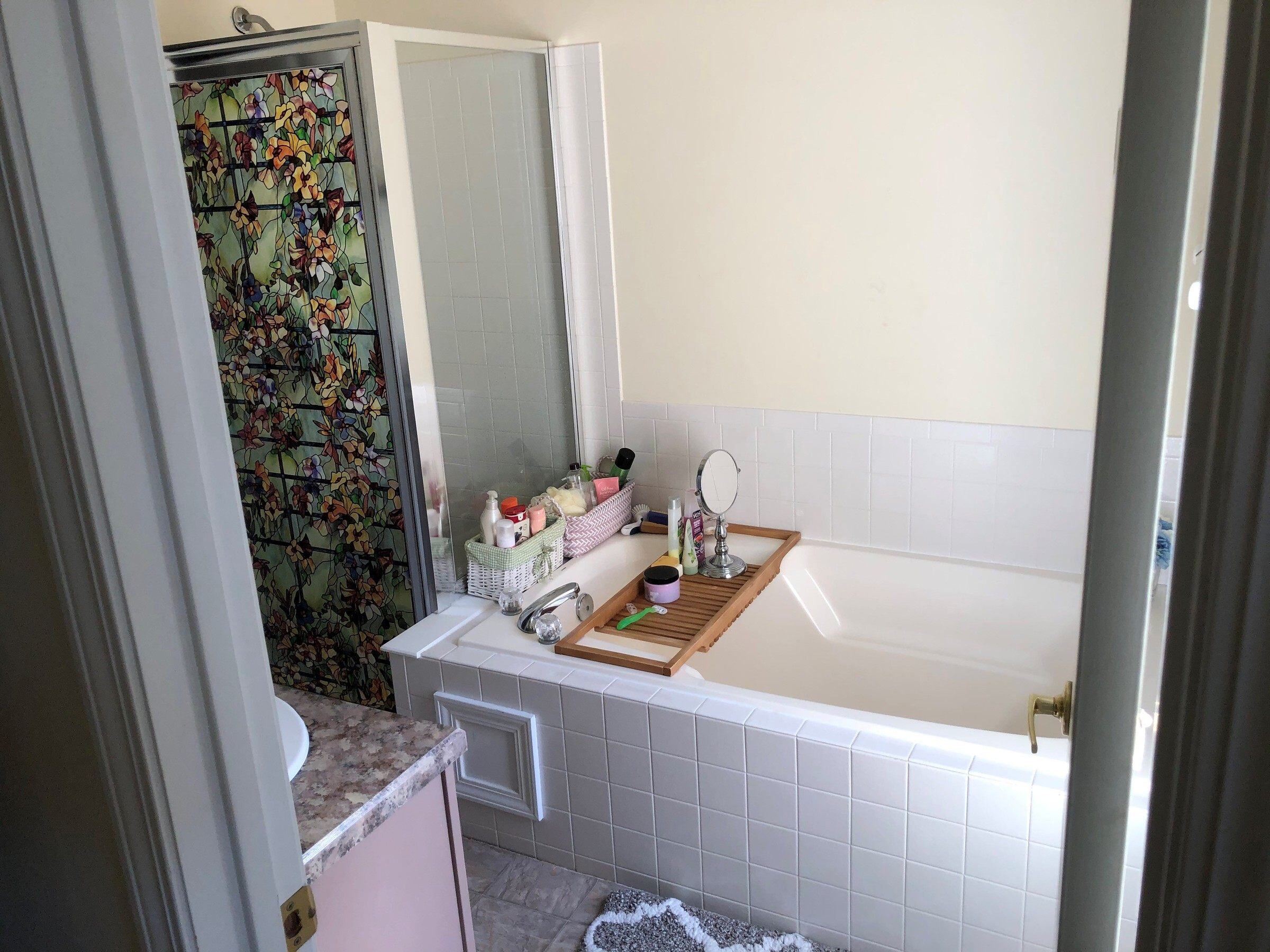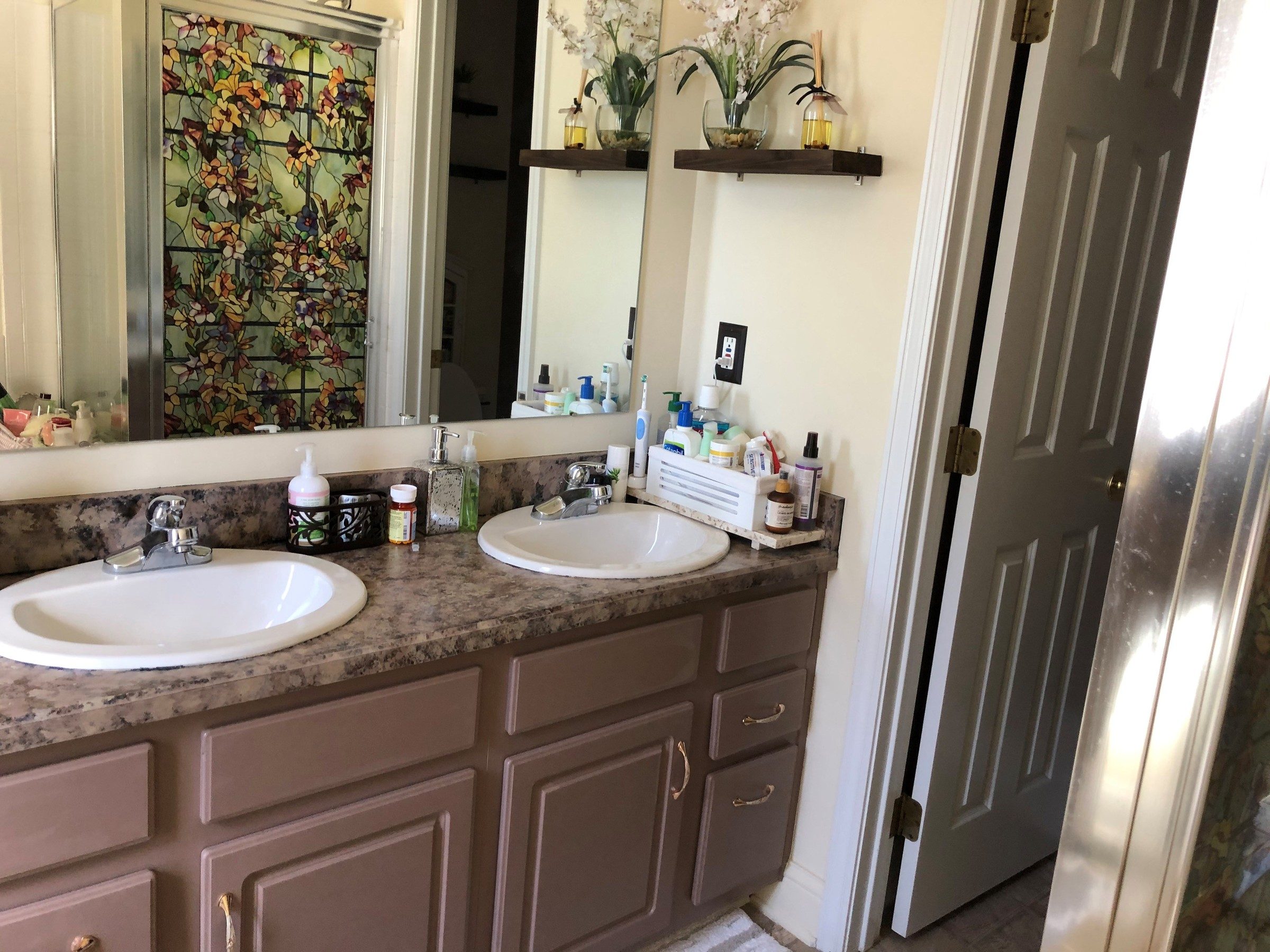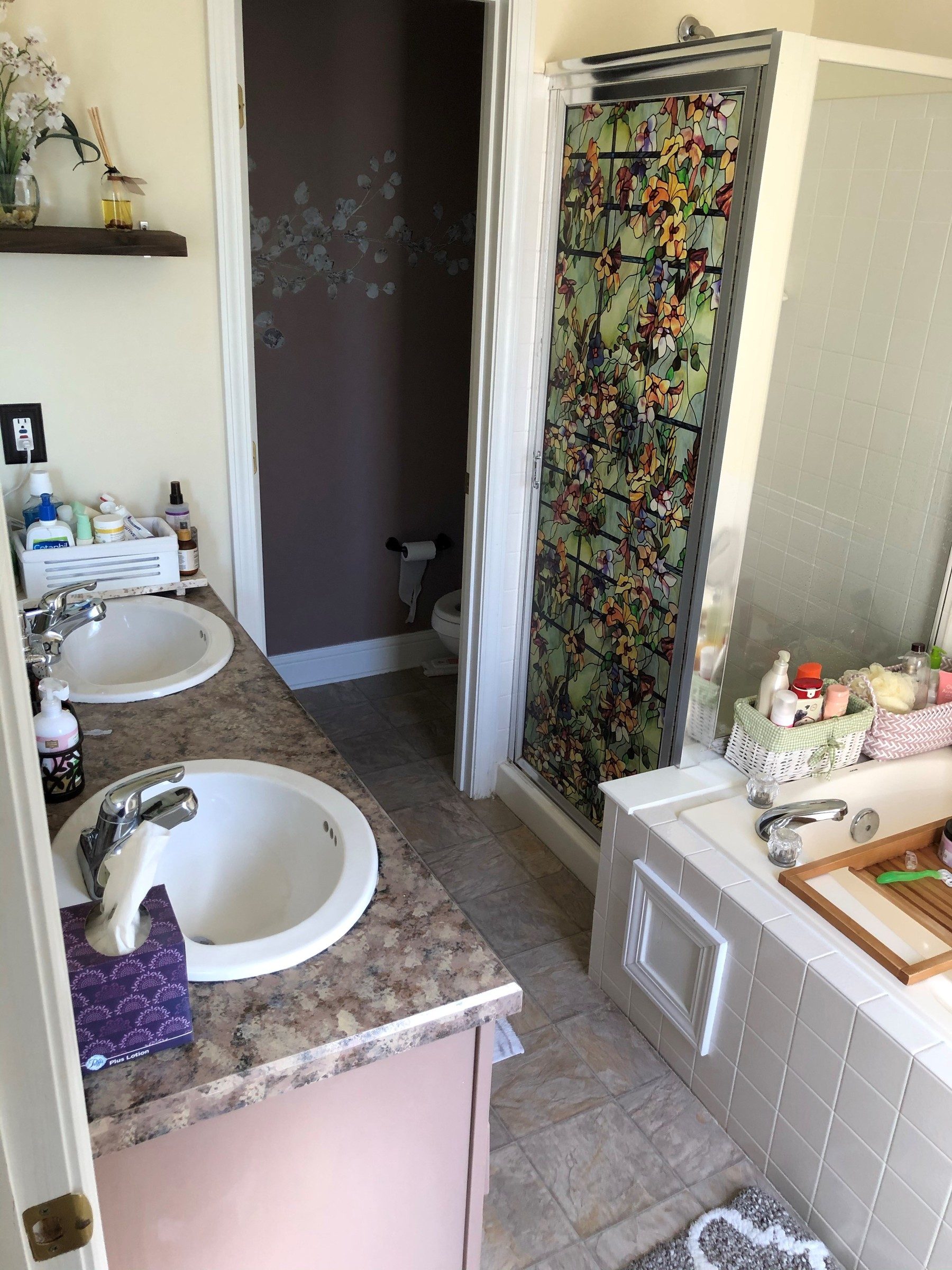 The vanity area is designed with functionality and style in mind, featuring a Kensington door style vanity in Sidewalk Grey, accented with oil rubbed bronze cabinet pulls. The glossy Pepper countertops not only enrich the space visually but also offer a durable surface that stands up to daily use, making it perfect for a busy household.